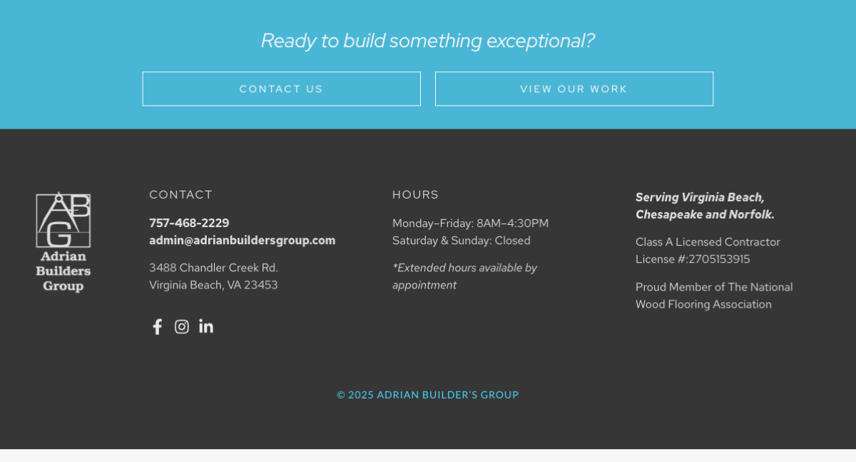 With over 30 years of experience in large-scale construction, Adrian Builders Group is a premier commercial and industrial general contractor serving Virginia and the Carolinas. Our approach combines integrity, technical expertise, and a client-centric mindset to deliver projects that last—on time and on budget.